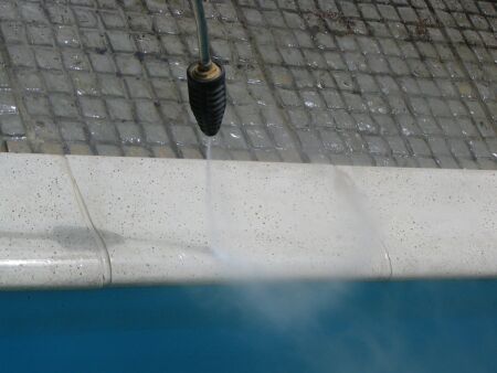 A kőfelületen megrekedő szennyeződés tisztítószer használata nélkül, nagynyomású vízborotvával könnyen eltávolítható. Általunk karbantartott medencéknél évi egyszeri alkalommal, a tavaszi beüzemeléskor, ez a vízborotvás mosás elegendő a kő újszerű állapotának visszanyeréséhez. Makacsabb szennyeződés esetén a speciális tisztítószerek is kaphatók nálunk.